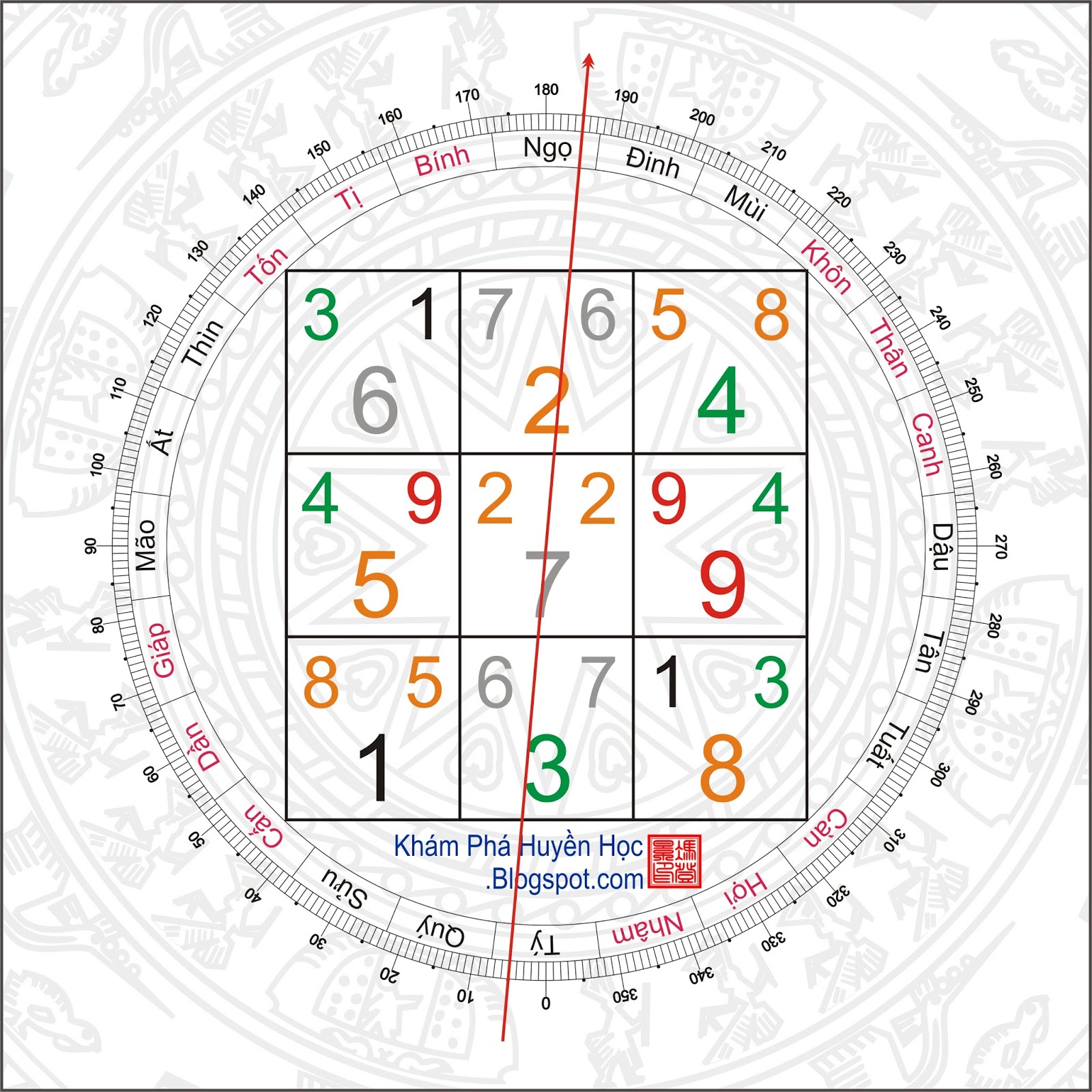 Ngôi nhà tọa Tý hướng Ngọ, kiêm hướng quá độ nên dùng thế quái để an sao. Được xây dựng và chuyển đến ở trong năm Quý Mùi 2003, thuộc cuối vận 7 trung nguyên nên có cách cục sơn thủy đảo nghịch. Diễn số phong thủy và sơ đồ bố cục nhà như sau: