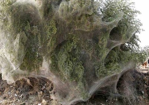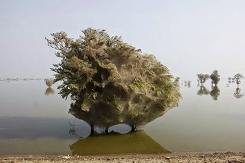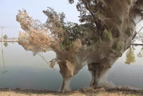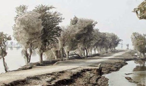 Sau một trận lũ kéo dài và khủng khiếp, mạng nhện bất ngờ phủ kín các cây cối tại một làng tại Pakistan tạo nên một cảnh tượng dị thường.